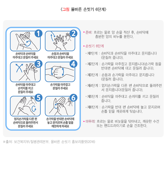 질병관리본부와 대한의사협회가 주도하는 ‘범국민 손씻기 운동본부’에서는 국민의 특성과 환경을 고려하여 준비와 마무리 과정을 나눈 6단계 손씻기 방법을 추천하고 있습니다. 비누로 손을 문지르는 6단계 과정은 시간이 길수록 좋지만, 대략 15~30초 정도만으로도 상당히 만족스러운 세정 효과를 기대할 수 있다고 합니다. 미국 질병통제예방센터에서는 약 20초 동안 손을 구석구석 씻을 것을 권장합니다.