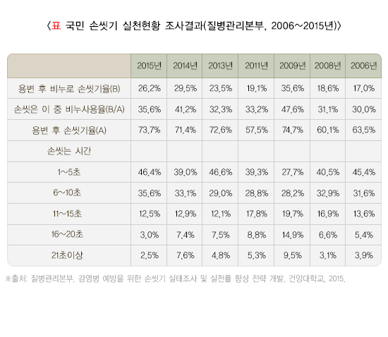 한국의 경우, 2005년에 실시된 조사에서는 비누로 손씻기를 실천하는 비율이 17%에 불과했지만, 2015년에는 26.2%로 점진적으로 나아지고 있는 상태라고합니다. 손씻기는 감염병 예방의 가장 기본적인 방법이지만, 국민들의 인식과 실천은 여전히 부족한 상황이라 정확한 손씻기 방법에 대해서 알아보려합니다.