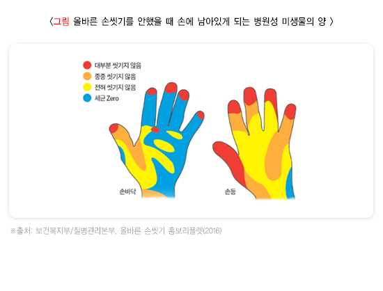 위에 적힌 것처럼 올바른 손씻기 방법을 실천하지 않았다면 보기에는 손이 깨끗해진 것처럼 보이더라도 많은 병원성 미생물이 손에 남아있을 수 있어 위험하므로 꼼꼼하게 손씻기를 하시기 바랍니다.